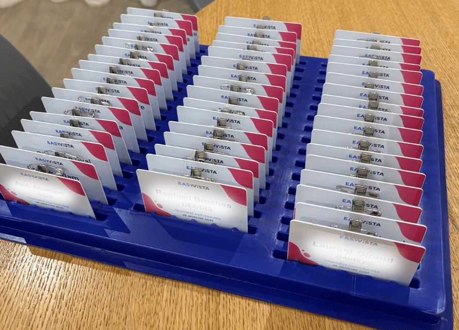 Mais vous pouvez aussi choisir d’imprimer les badges en amont, et de louer nos machines pour imprimer les badges des derniers inscrits. Imprimer les badges sur place évite de chercher pendant de longues minutes un badge nominatif parmi une centaines.